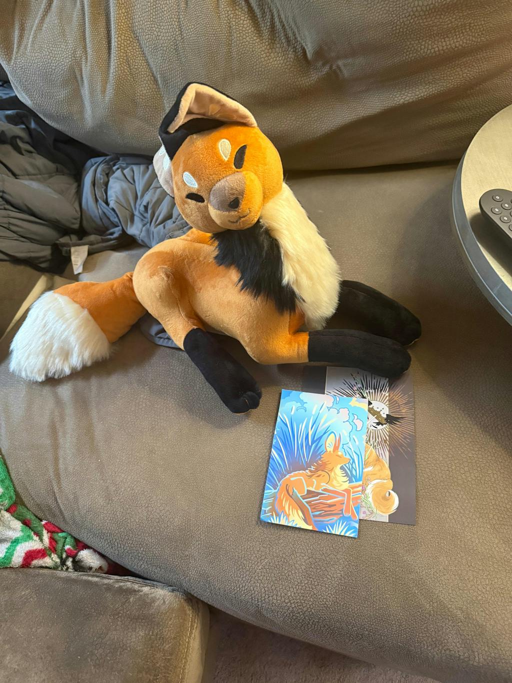 Arrived fast and came with other goodies! Had to mess with the ears to get them in a natural position, but when I got them where I wanted them, they stayed more or less in that position. With the exception of the furred areas, it's a lot more of a plushie than a stuffed animal. The tail is only attached across the seam and not as firm as the rest. Some tiny flaws, otherwise love the quality.
